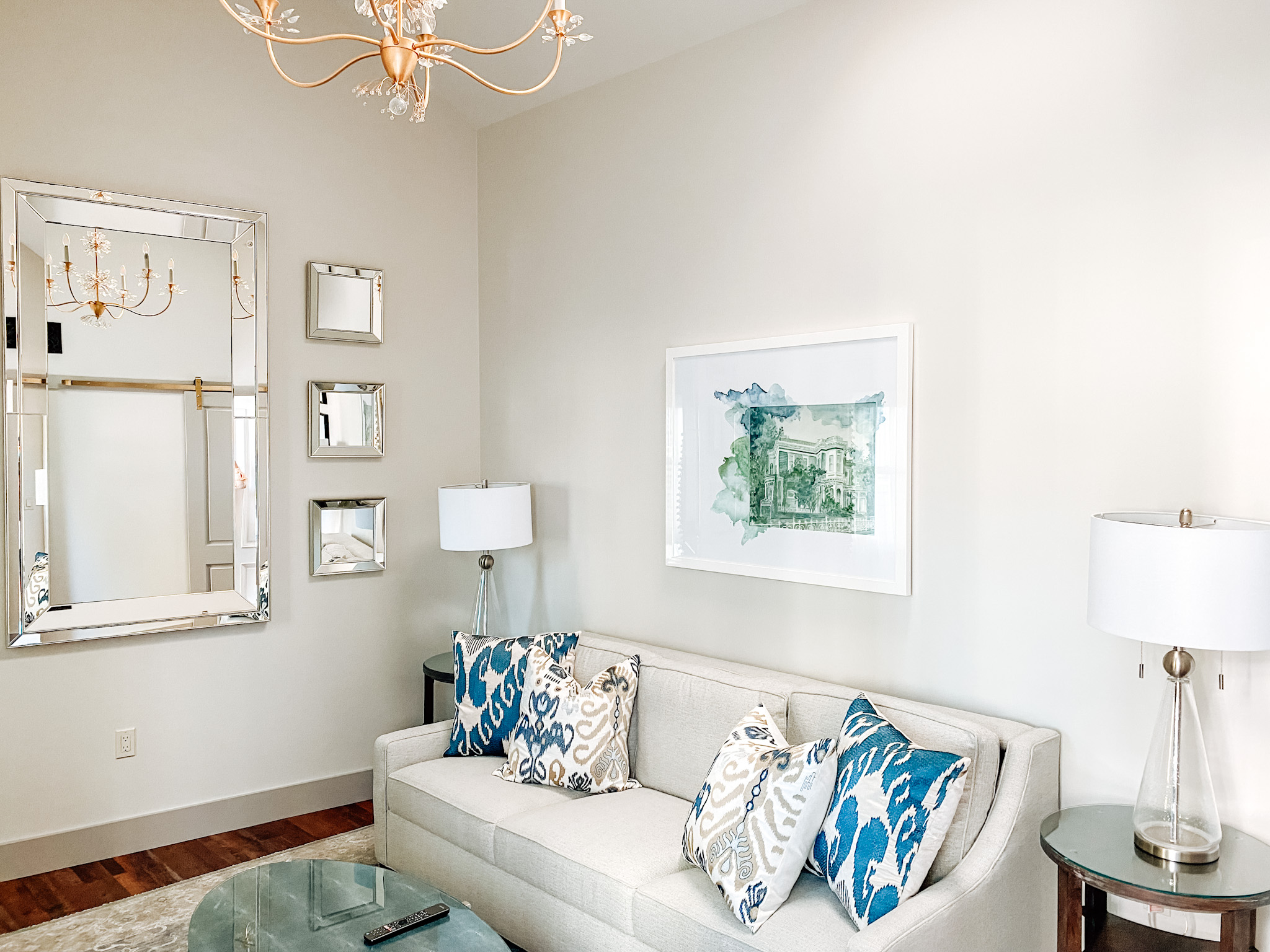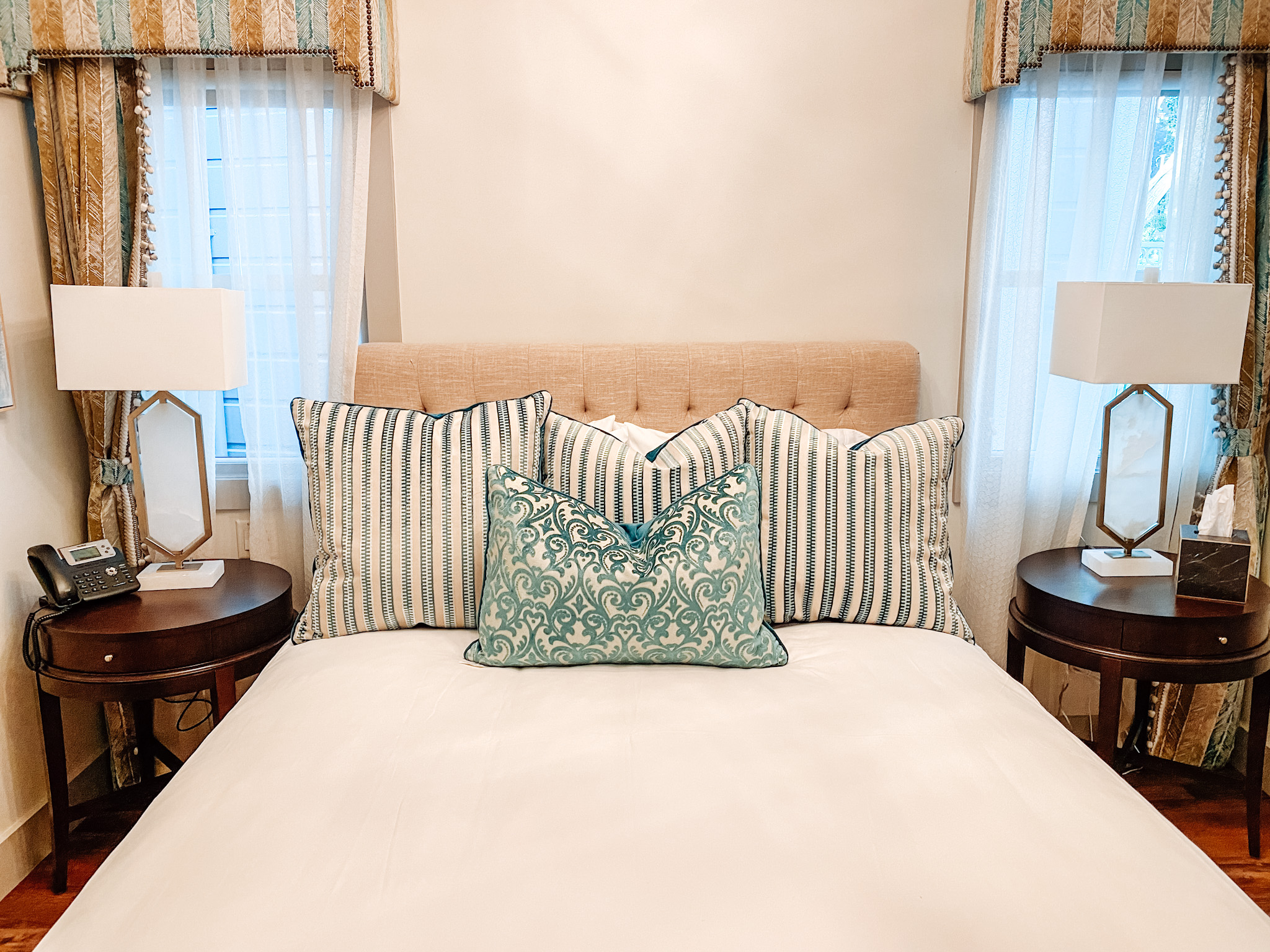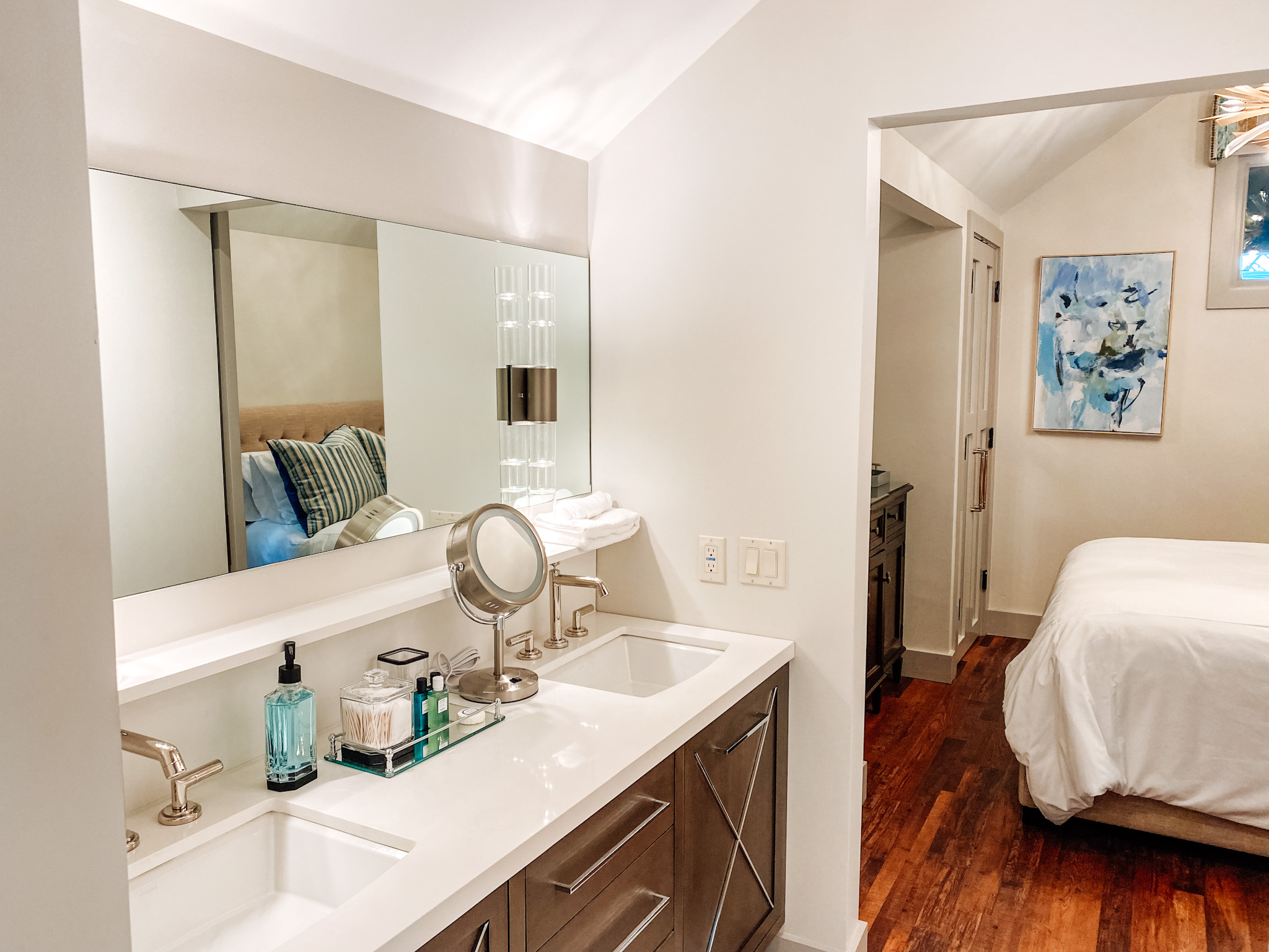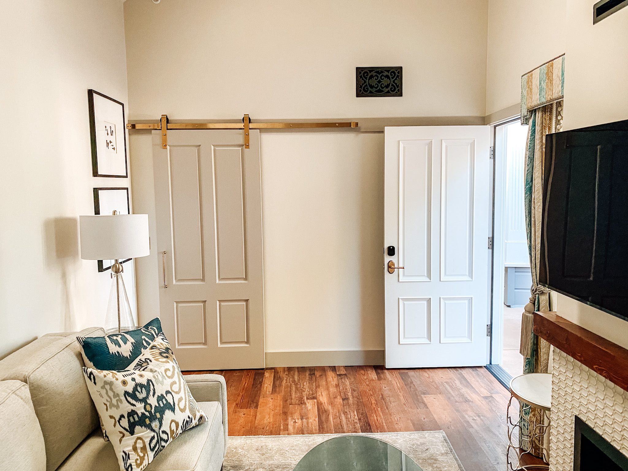 Our Carriage House Suite is situated within a historic carriage building dating back to 1879. Located steps from the main estate in its own building, the Carriage House features a queen bed, private bathroom with exquisitely tiled shower, and luxurious separate separate area with barn doors separating the two rooms. The seating area includes a fireplace, as well as a sofa that can convert into a king sized bed. A perfect suite for families traveling with pets or children!