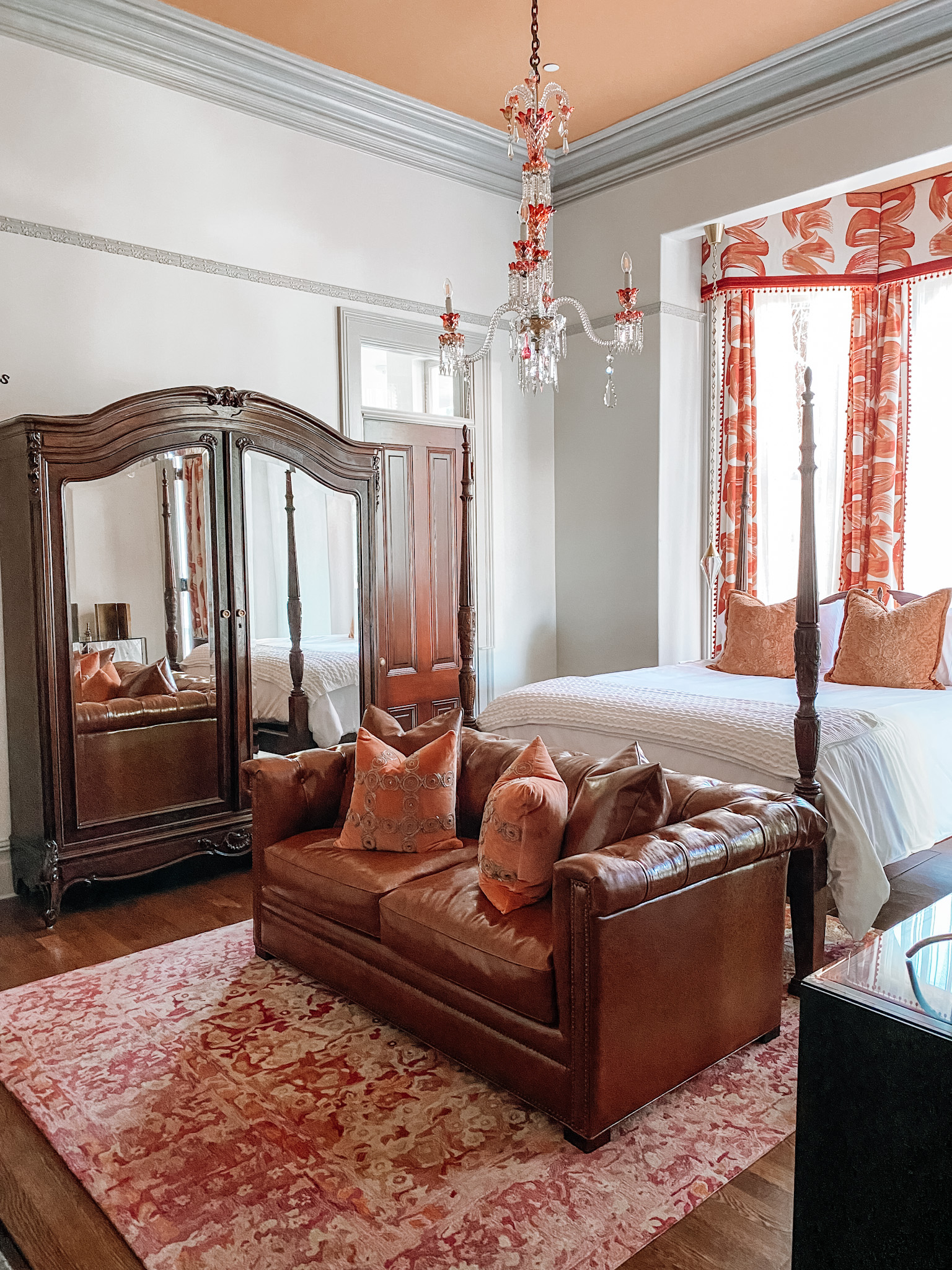 Once the library of the original McClelland-Priest house, the Library Suite exudes romantic Victorian elegance. This spacious room is located on the ground floor of the property and features 16 ft. ceilings, a Victorian-era chandelier that is original to the estate, a meticulously restored four poster bed with California King mattress, an antique armoire, a private library for you to explore, a loveseat sofa, and an adjoining door with direct access to the estate's wrap around porch. The spacious en suite bathroom features an exquisitely tiled shower with Kohler deep soaking tub, and luxurious bath amenities by Hermés. Sleeps 2 guests.